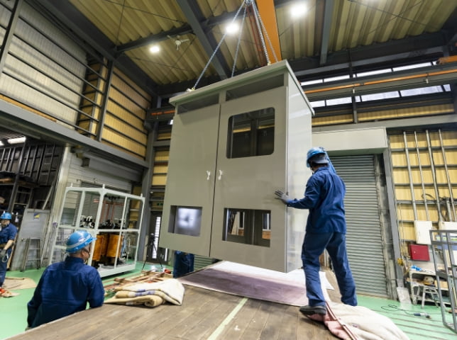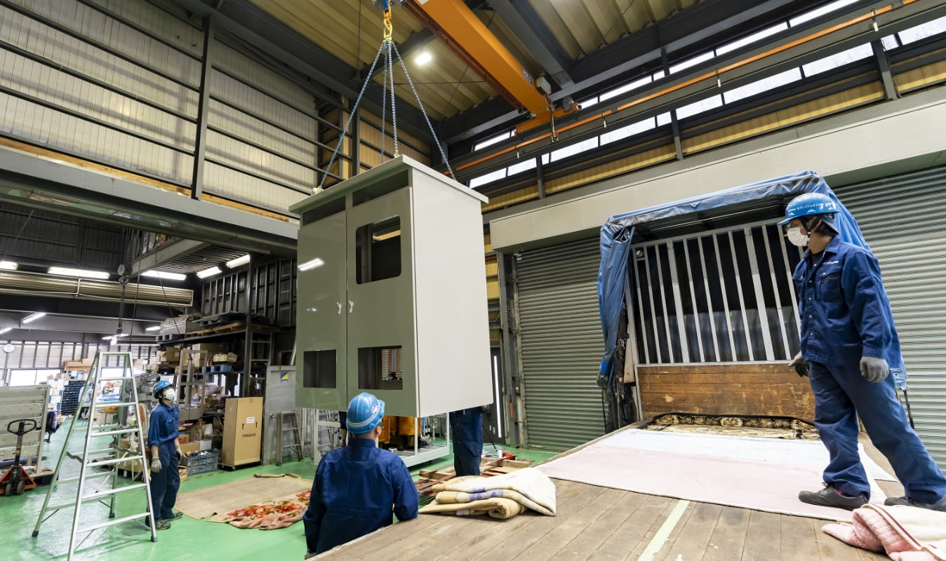 検査に合格した配電盤をビニール梱包し自社工場から設置場所まで確実に搬送します。職人の手で現場での据付、調整まで行います。
