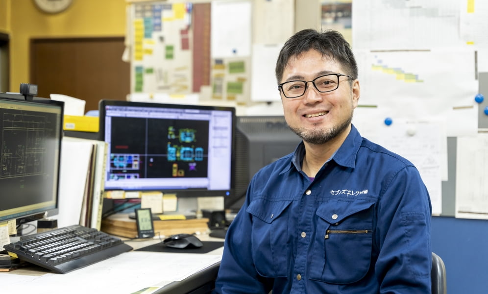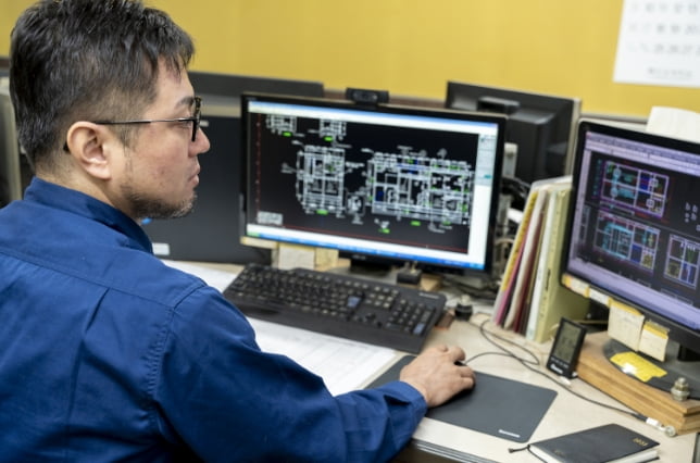 配電盤や制御盤の設計は、お客様からの仕様書に沿って作図する場合と、仕様をうかがって当社で作図するパターンがあります。仕様が決まっている設計はさほど難しくありませんが、こちらで設計する時はイマジネーションを膨らませながら作図しています。組み立ての職人が作業しやすいように電気部品の場所やケーブルの配線も考えるのも私の役目ですね。
