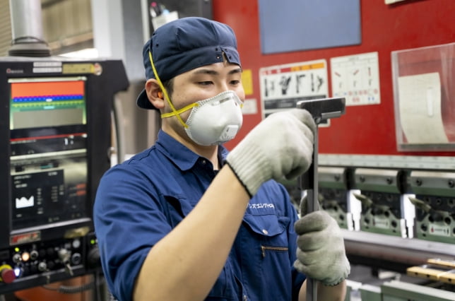 入社以来、設計図に沿って板金を型抜きした後に曲げ、組み付け、溶接する「板金加工」の作業を担当しています。もともと「ものづくり」に興味があって、特に溶接をする製品の製造に携わりたいと考えていたので、毎日が充実しています。